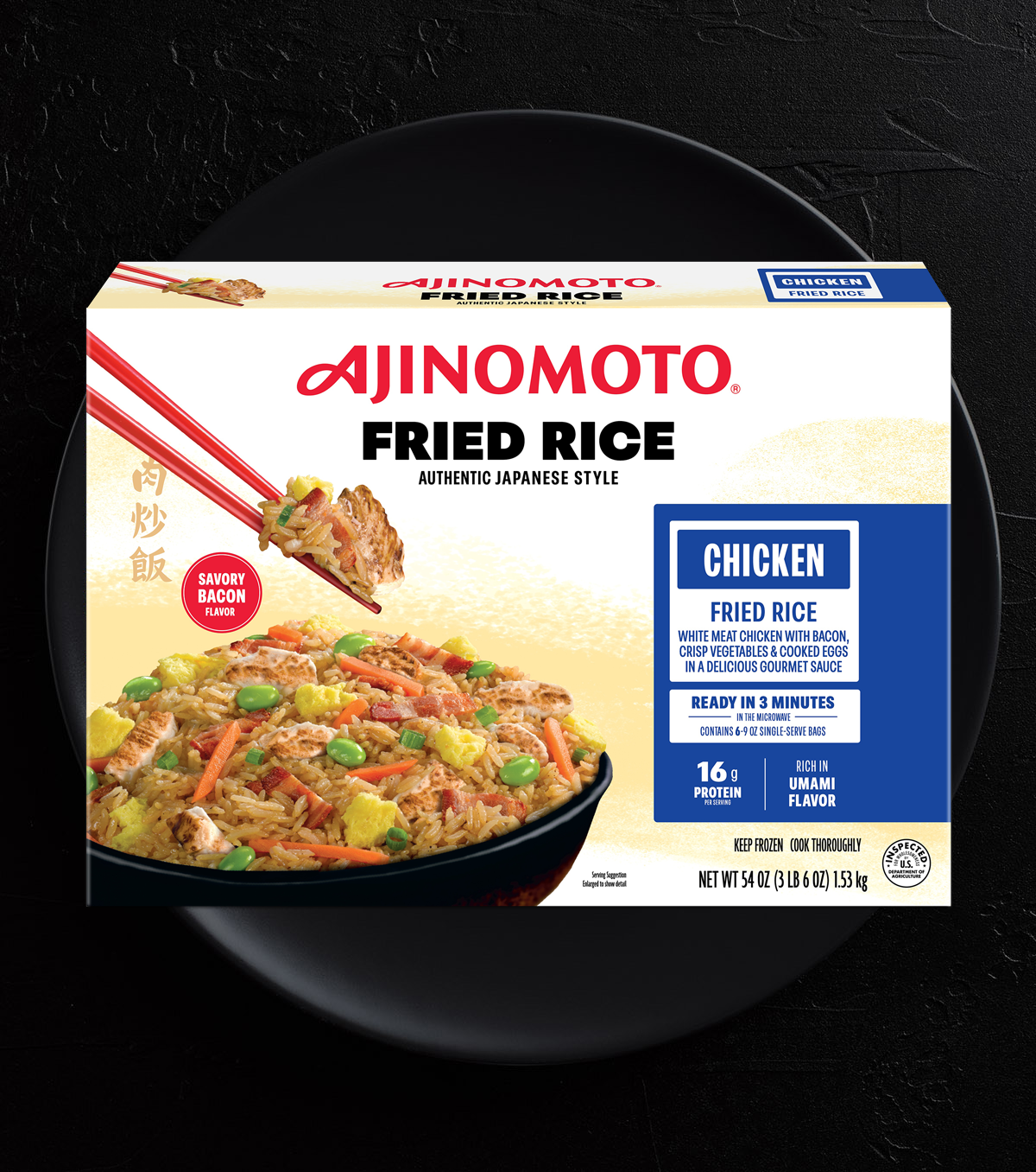 COOKED RICE, COOKED CHICKEN BREAST MEAT-STRIPS (CHICKEN BREAST MEAT, WATER, SUGAR, MODIFIED FOOD STARCH, SALT, SODIUM PHOSPHATE, GARLIC POWDER, CELERY POWDER), COOKED SEASONED EGGS (WHOLE EGGS, WHEY, WATER, CONTAINS, 2% OR LESS OF THE FOLLOWING: SOYBEAN OIL, DRIED CREAM CHEESE [PASTEURIZED MILK AND CREAM, CHEESE CULTURE, SALT, CAROB BEAN GUM], MODIFIED CORN STARCH, SALT, NATURAL FLAVOR, ARTIFICIAL BUTTER FLAVOR [MEDIUM CHAIN TRIGLYCERIDES, ARTIFICIAL FLAVORS), XANTHAN GUM, CITRIC ACID, GUAR GUM), BACON (CURED WITH WATER, SALT, SUGAR, SODIUM PHOSPHATES, SODIUM ERYTHORBATE, SODIUM NITRITE, MAY CONTAIN HONEY), SOY SAUCE (WATER, WHEAT, SOYBEANS, SALT, ALCOHOL), CARROT, ONION, EDAMAME SOYBEANS, CONTAINS LESS THAN 2% OF EACH OF THE FOLLOWING: CANOLA OIL, RENDERED BACON FAT (RENDERED BACON FAT (CURED WITH WATER, SALT, SUGAR, SODIUM ERYTHORBATE, SODIUM NITRITE, MAY ALSO CONTAIN SMOKE FLAVORING, DEXTROSE, BROWN SUGAR, SODIUM PHOSPHATE, POTASSIUM CHLORIDE, SODIUM DIACETATE, FLAVORING, HONEY], TBHQ, CITRIC ACID), SWEET COOKING RICE WINE (WATER, MIRIN [WATER, RICE, ALCOHOL, SALT, ENZYME, KOJI {ASPERGILLUS ORYZAE}], DEXTROSE, CORN SYRUP SOLIDS, LACTIC ACID, SUCCINIC ACID), GREEN ONION, SALT, SUGAR, SPICES, CARAMEL COLOR, GARLIC POWDER, DISODIUM INOSINATE, DISODIUM GUANYLATE.